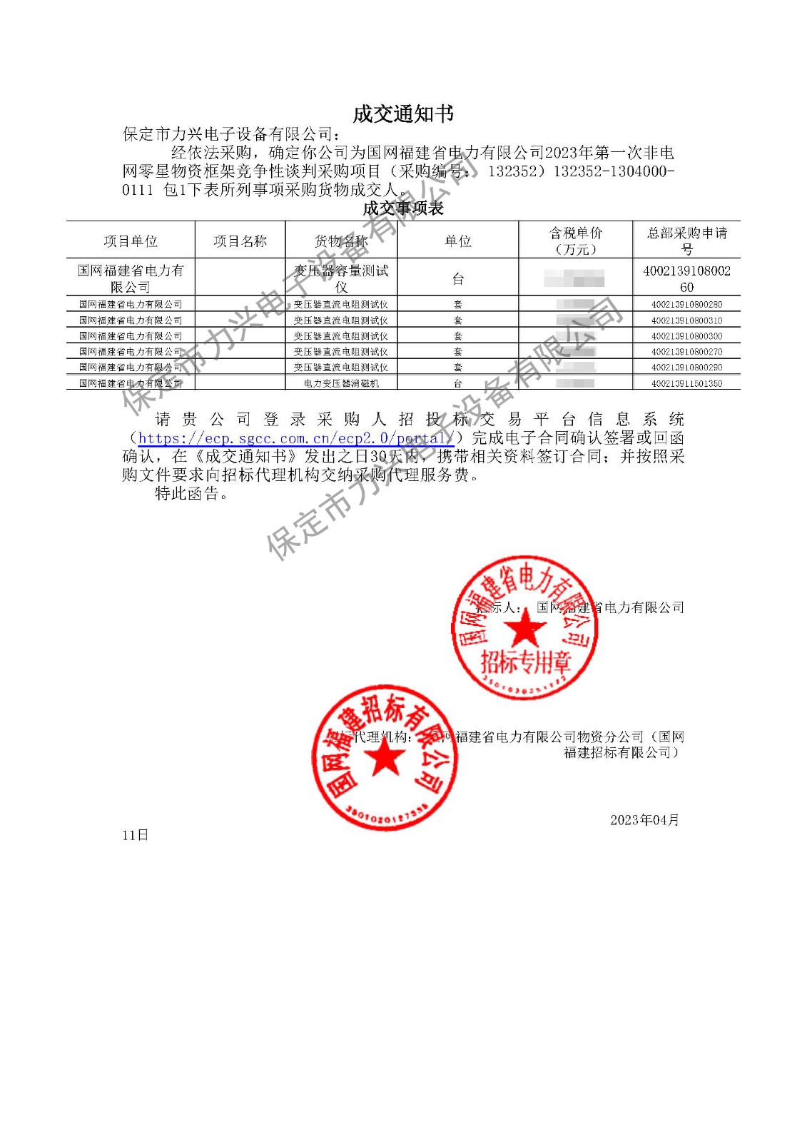 5. 2023.06.25 國網(wǎng)天津市電力公司2023年第三次物資競爭性談判項目(中標(biāo)2個包)